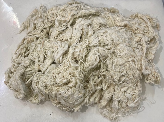 Shown here is natural scored mechanical hemp cotton. This can be mixed to make hemp yarn.